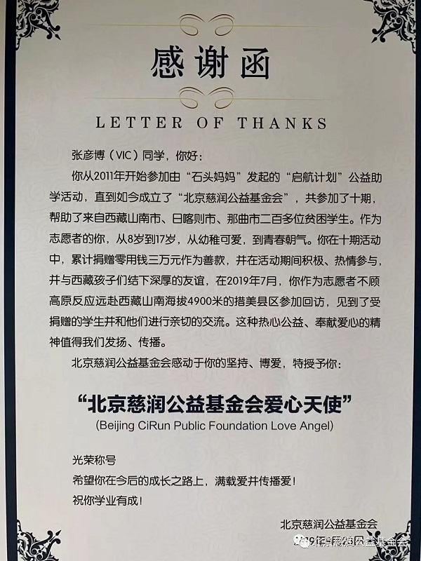 此时,在我面临申请美国大学之际,收到了石头妈妈的一封感谢函,希望能够对我的升学有帮助。这一刻,我又懂得了爱出者爱返、福往者福来。感恩我的成长里遇见启航。