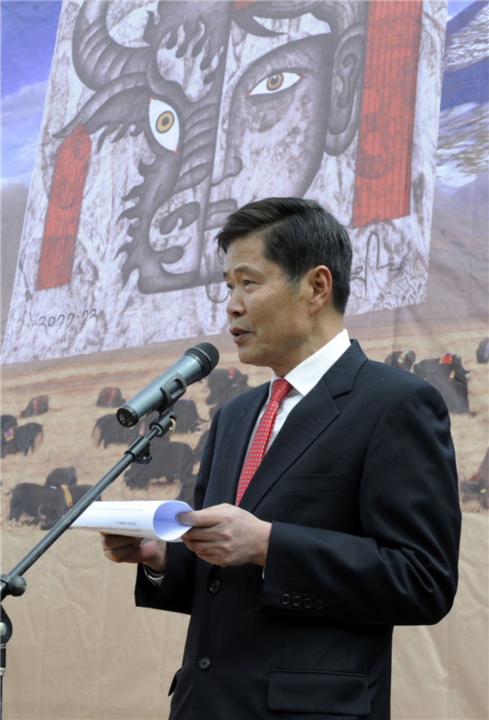 吴雨初在西藏牦牛藏品捐赠活动上致辞(2013年5月18日摄)。新华社记者 觉果 摄