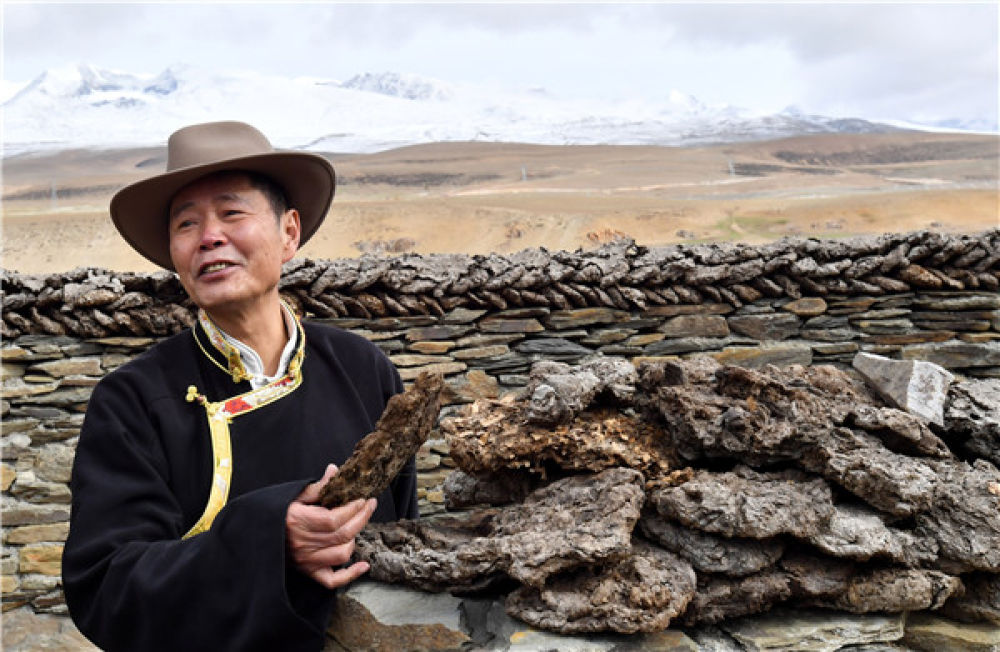 吴雨初在藏北草原上收集牛粪(5月23日摄)。新华社记者 觉果 摄